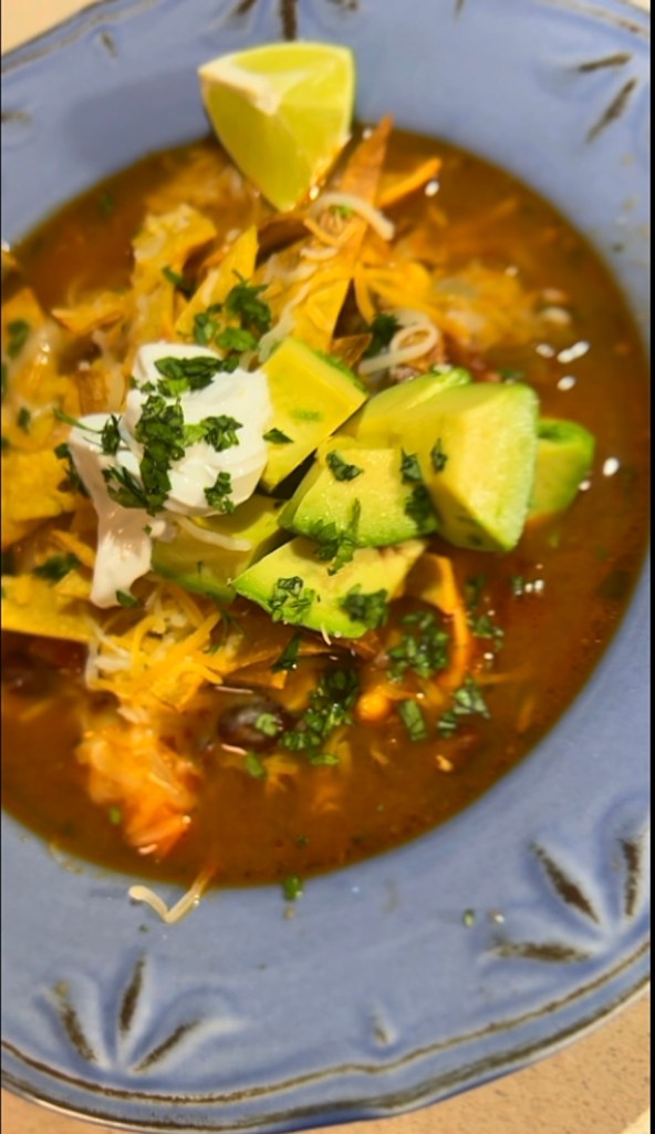 - Serve soup with corn tortillas chips, avocado, shredded cheese, and/ or sour cream. sprinkle with left over chopped cilantro (to be fancy)